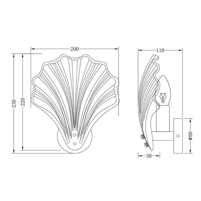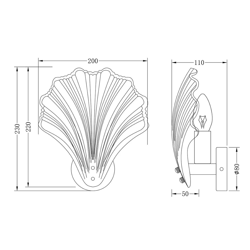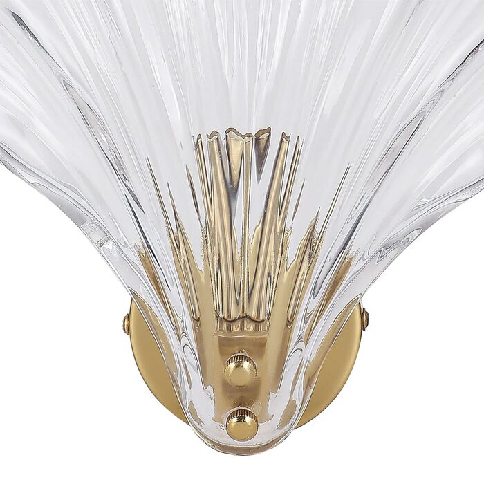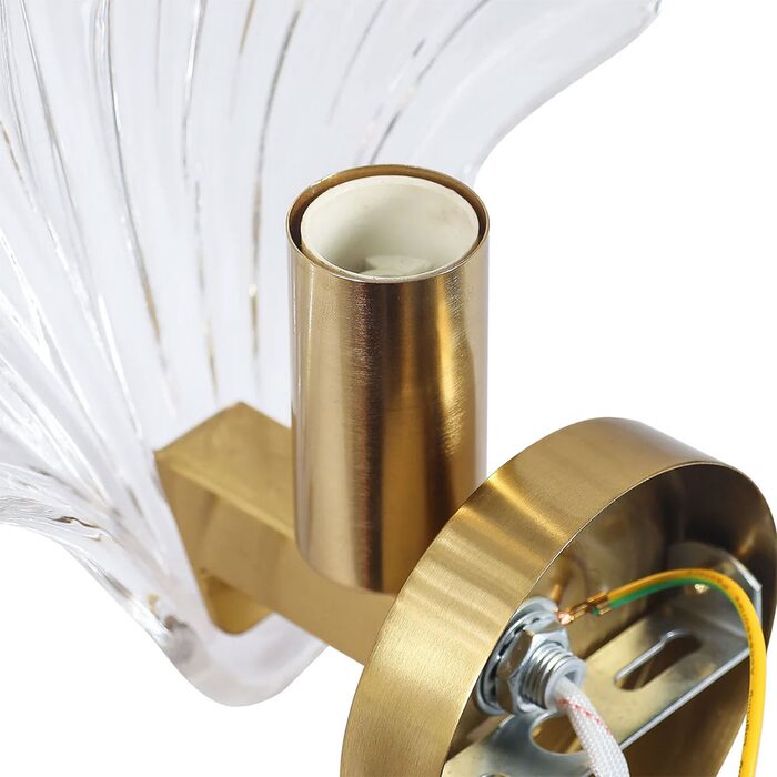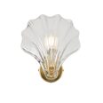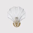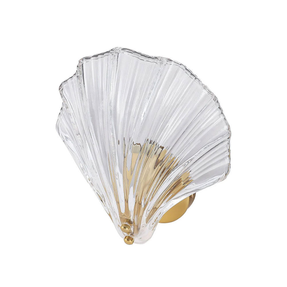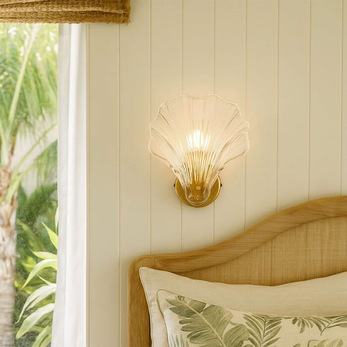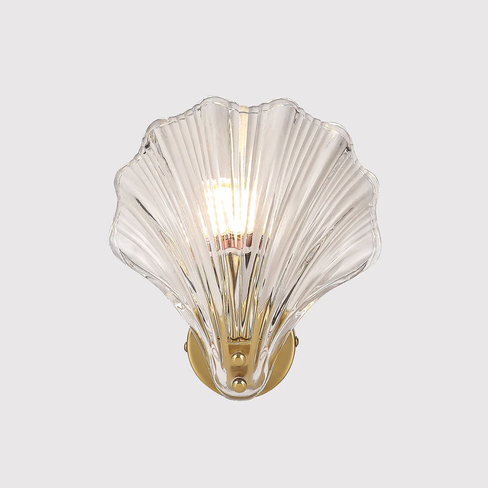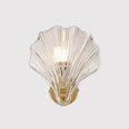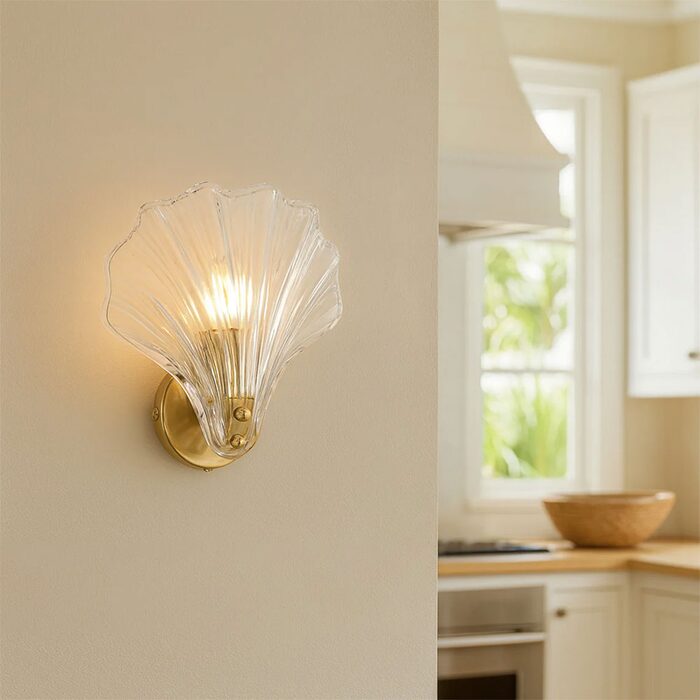 This exquisite fixture showcases a delicate, shell-shaped glass shade with vertical ribbing that gracefully echoes natural seashell lines, casting soft, sculptural light patterns when lit.