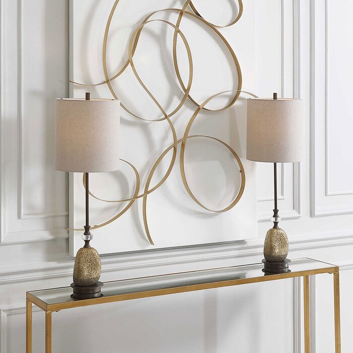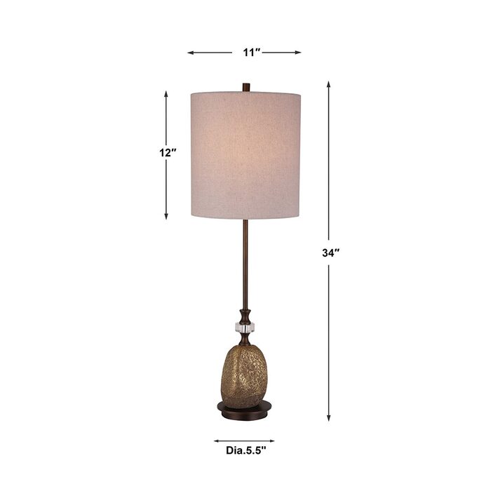 Finished in a plated dark bronze with crystal accents, this buffet lamp showcases a bright gold leaf ceramic accent with a unique, organic look and fine textural detail.