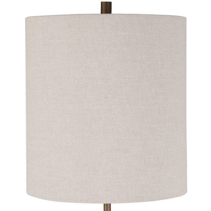 The lamp is accented by a round light oatmeal linen fabric shade.