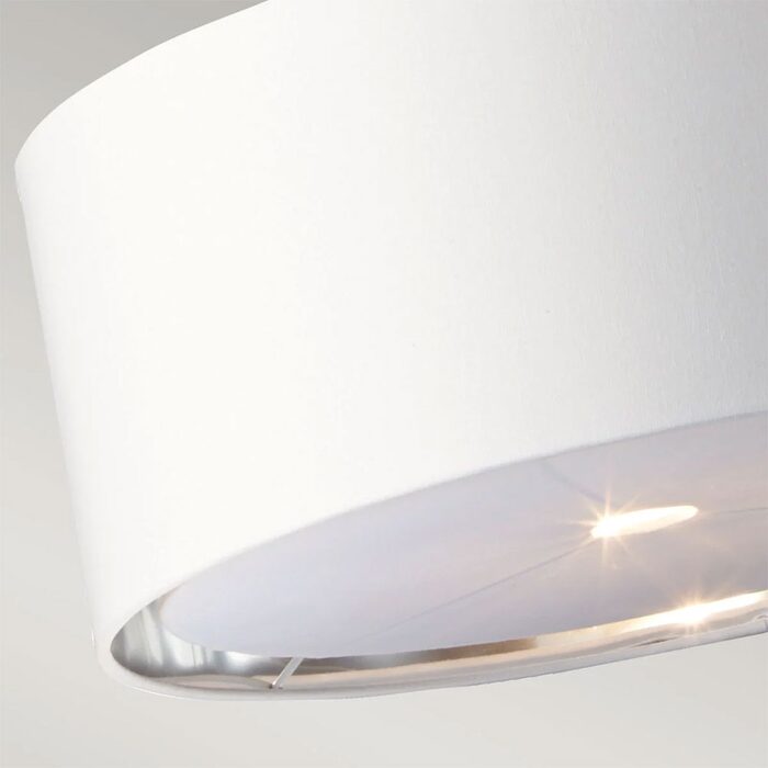 Each shade has a white laminate lining. Pendants, table and floor lamps have fabric diffusers, and the chandeliers and wall lights include acrylic diffusers.