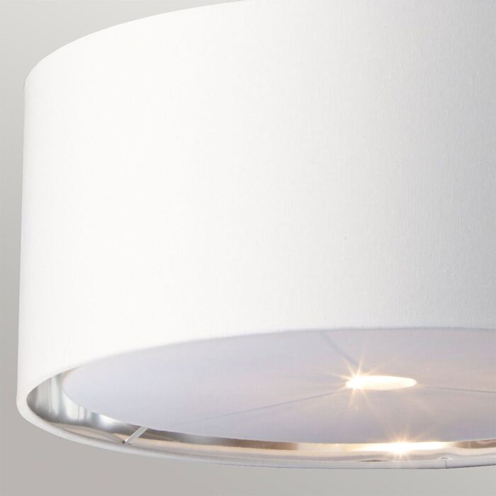 Each shade has a silver metallic lining. Pendants, table and floor lamps have fabric diffusers, and the chandeliers and wall lights include acrylic diffusers.