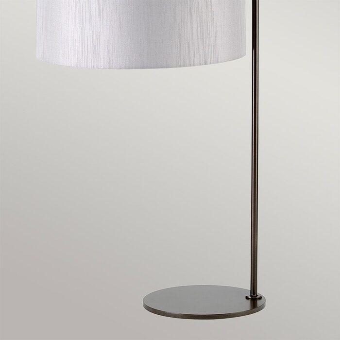 Dark brown painted table lamp with simple modern frame. Includes grey cylinder shade and fabric diffuser.