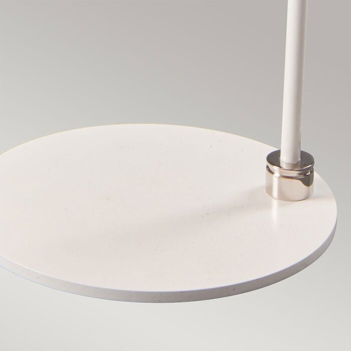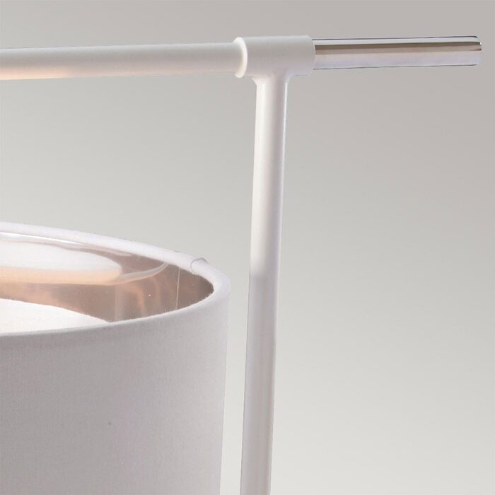 Two-tone table lamp finished in White with Polished Nickel accents. Includes a white cylinder shade with mirror silver laminate lining.