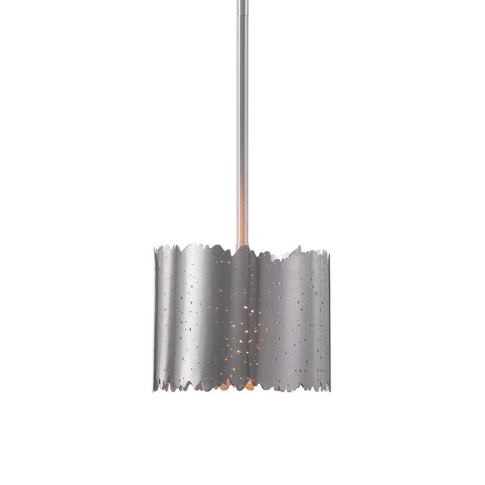 Modern in design feel, our mini pendant is finished in a satin brushed nickel featuring a pierced metal shade with raw jagged edges.