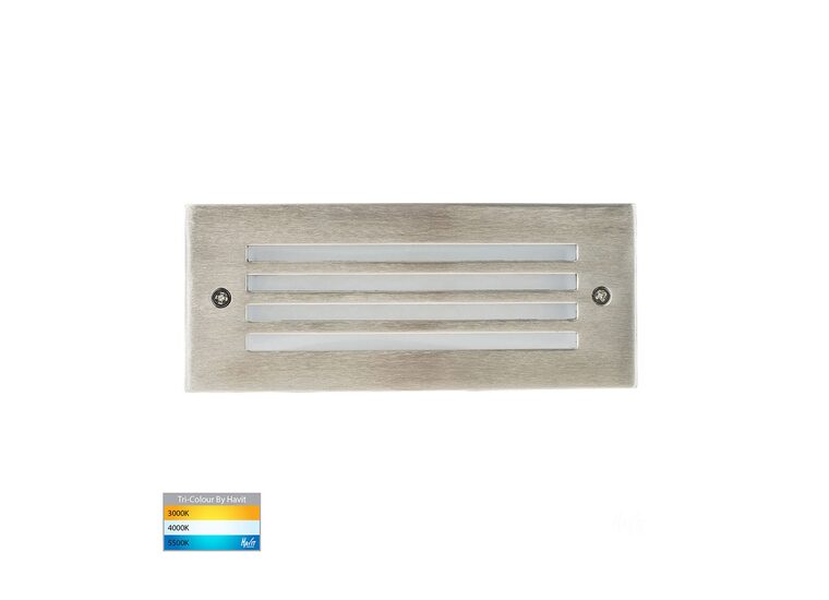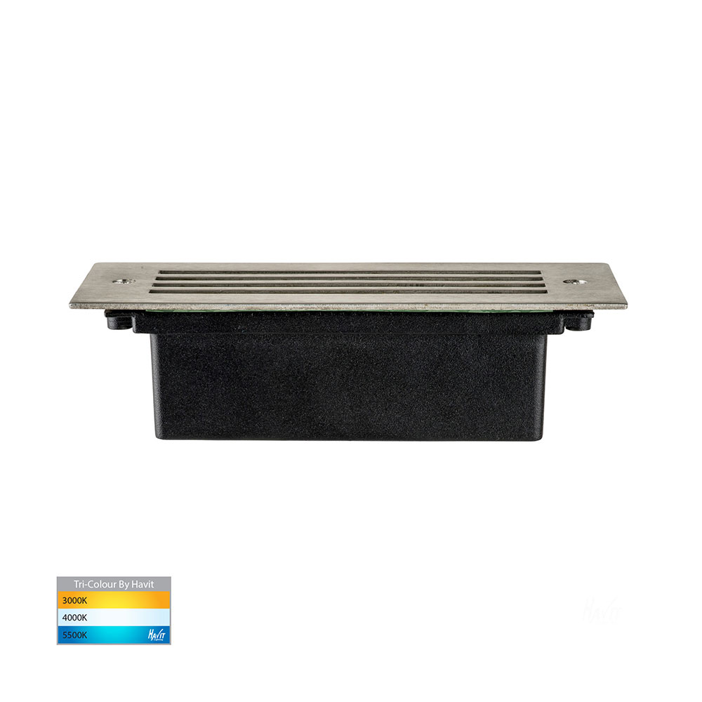 The HV3008T-SS316-240V is a Havit 'Bata' 3W, tri-colour, 240V AC recessed brick light with a durable 316 stainless steel face, die-cast aluminium body, frosted tempered glass, and a grill face.