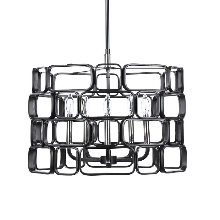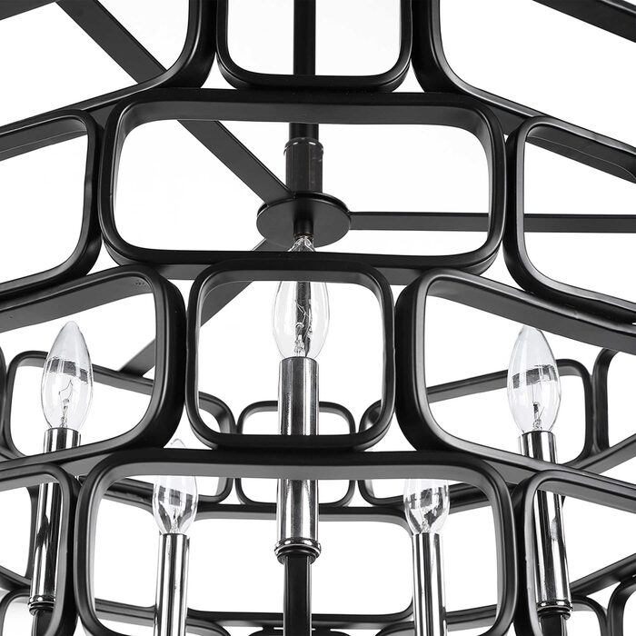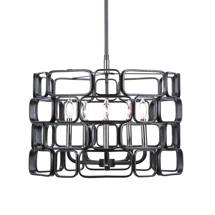 Stylish geometric squares and rectangles with gently rounded edges come together in a mosaic patterned outer shade finished in matte Black with polished nickel accents completing this 5 Lt pendant. With 5-60 watt max candelabra sockets.