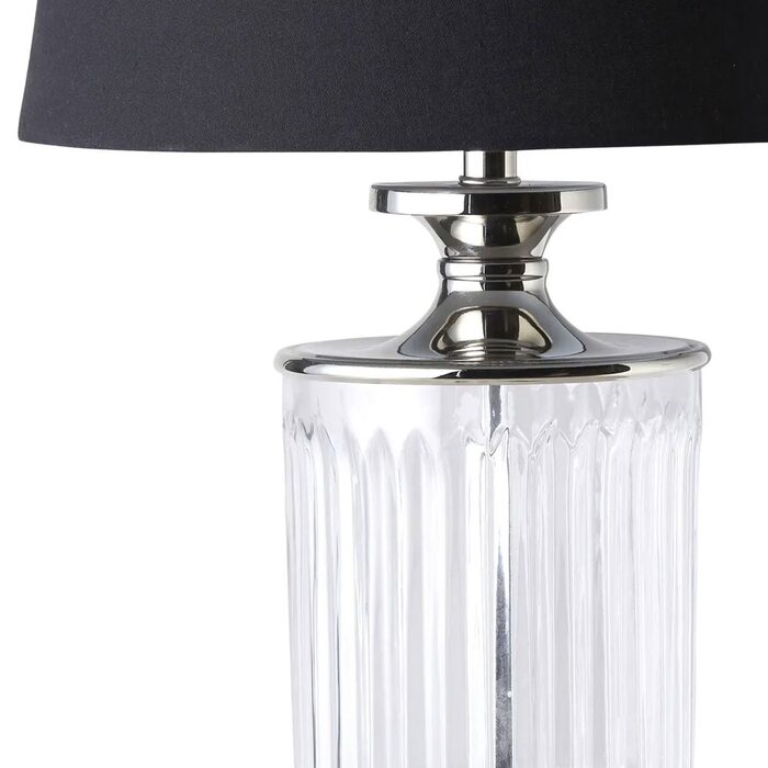 This regal design is comprised of a trophy-shaped base made from glass and iron, completed with a black linen shade.
