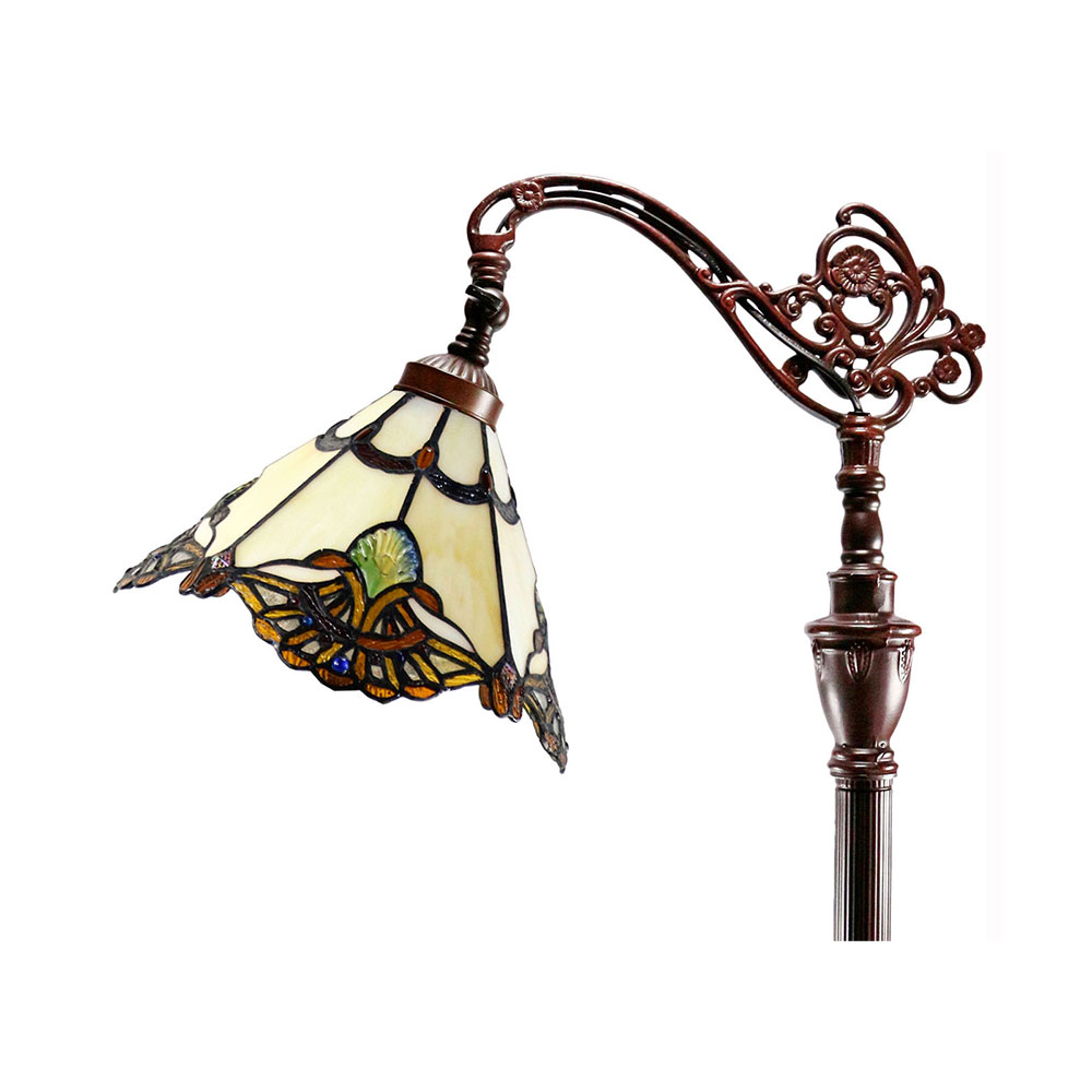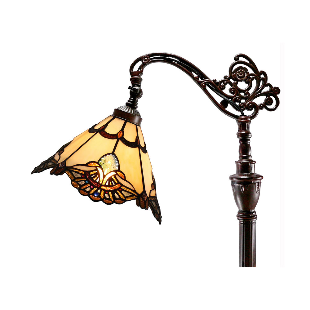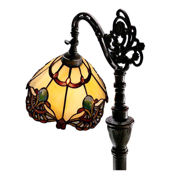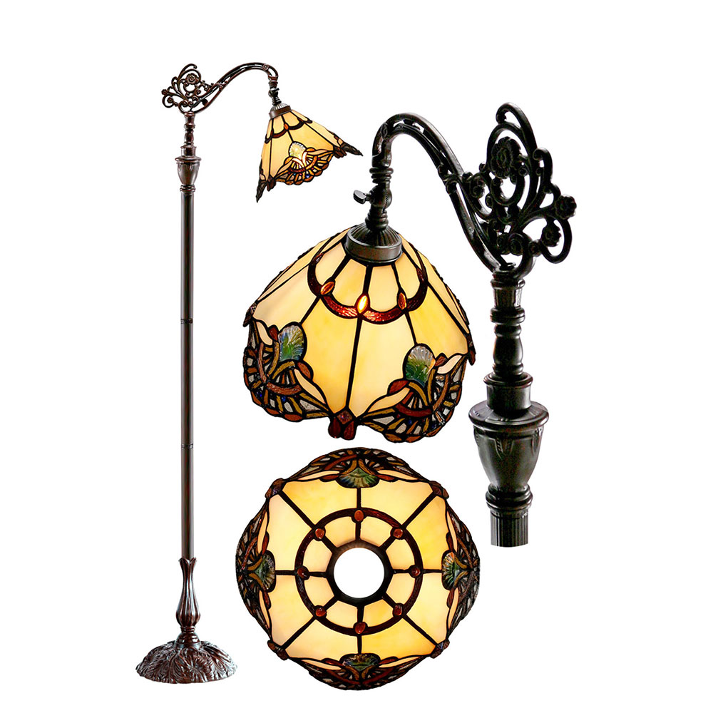 This beautiful Tiffany floor lamp features a handcrafted, genuine stained art glass shade combined with a beautiful carved art deco bridge, base and frame made of resin.