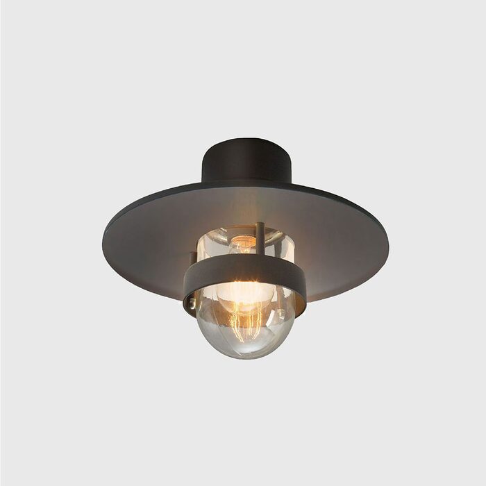 Bergen Ceiling Light is a metal outdoor fixture with clear glass.