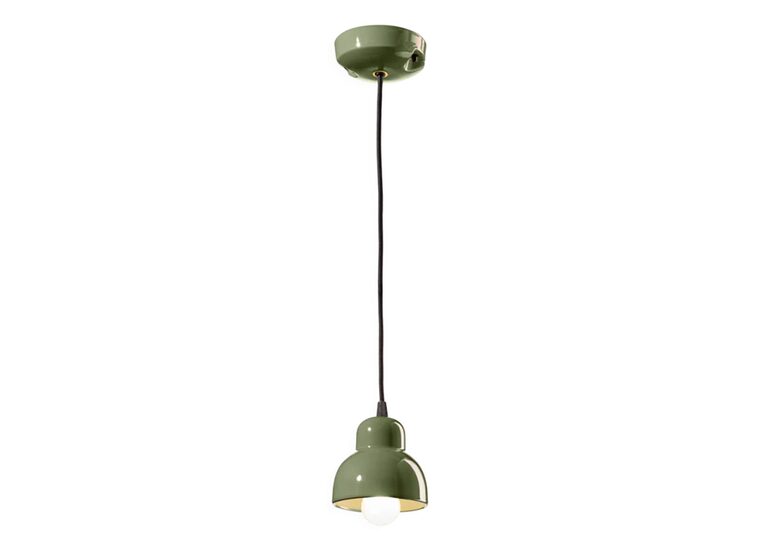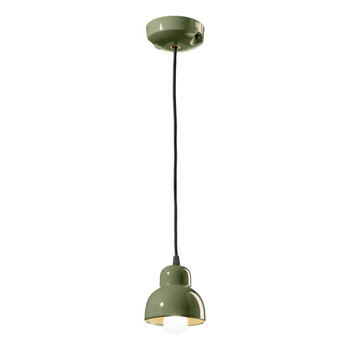 The Berimbau Small Pendant Light by Ferroluce is crafted from ceramic and features a bold sage green finish.