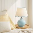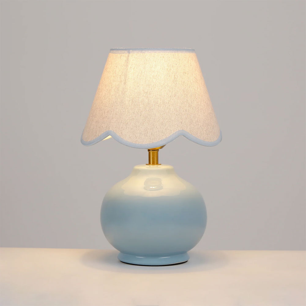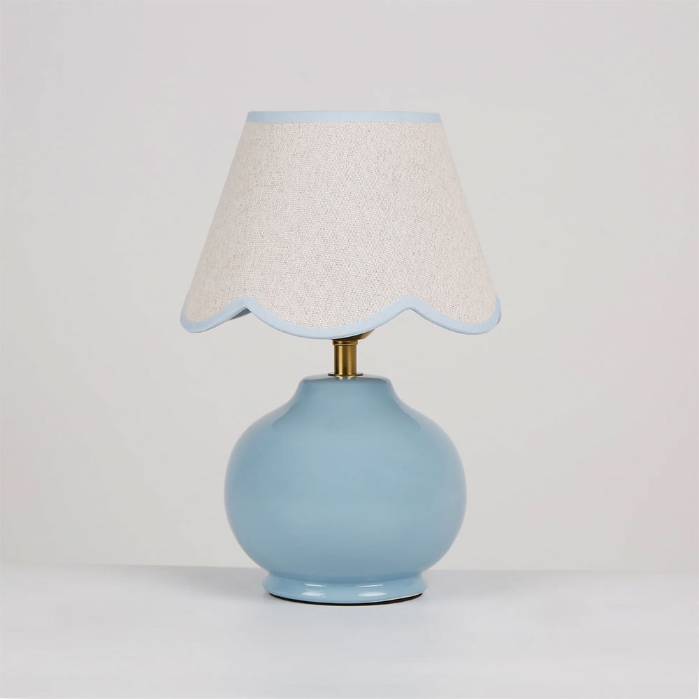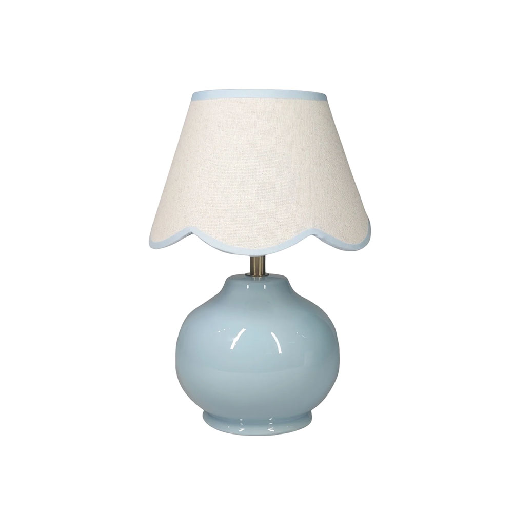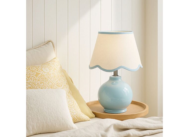 Illuminate your space with the versatile Bibury Table Lamp, featuring a stunning ceramic base available in Blue, Grey, and topped with a timeless linen shade adorned with a subtle, modern scallop design.