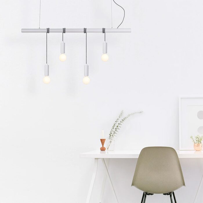 The Bikkel Four Light Pendant comes in black and white and requires four E27 globes.