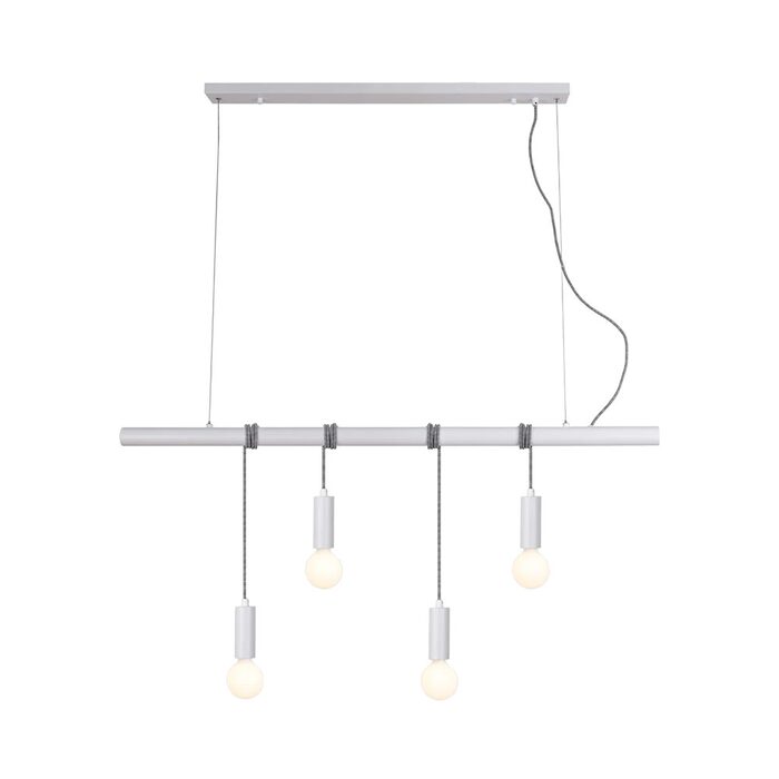 The four globe holders that drop from the lighting bar each have long grey braided cords that can be wrapped around the lighting bar to set heights individually.