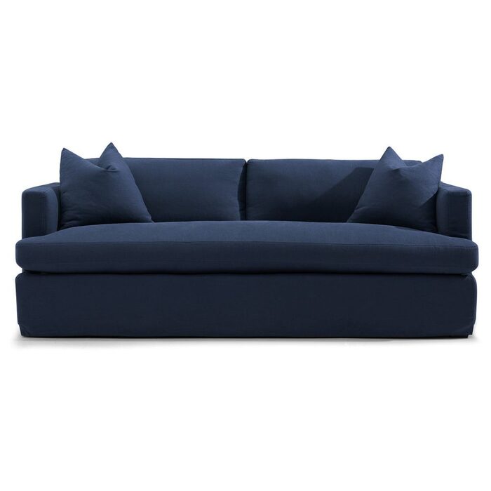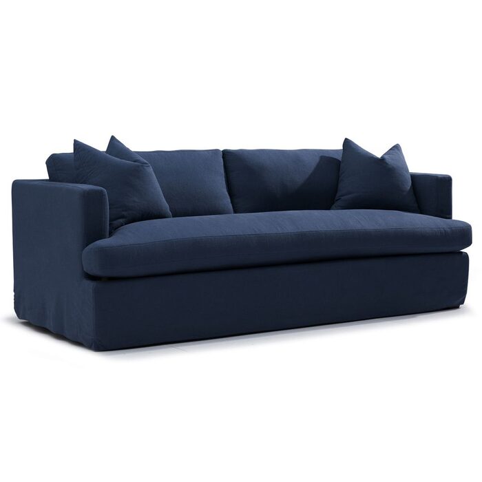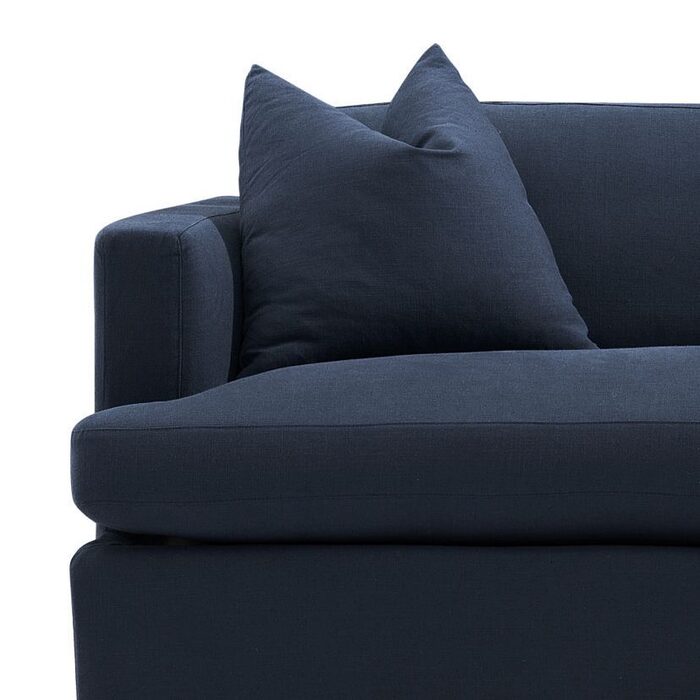 Navy linen 3 seater slip cover sofa. Comfortable soft seating & back with feather & foam fill.