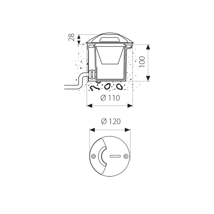 Boluce Trek Mini modern round exterior inground light. IP67. Die-cast aluminium body, tempered satin glass diffuser.