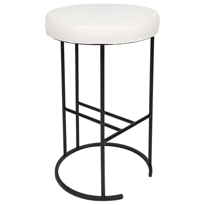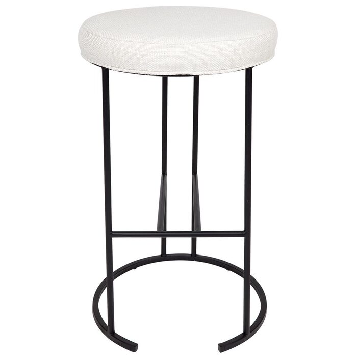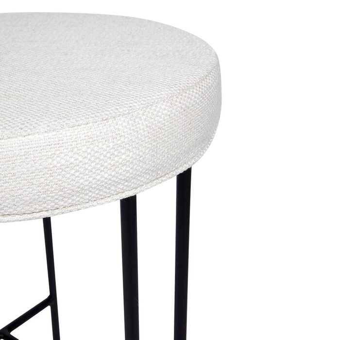 Natural linen upholstered kitchen stool with an elegant black design iron frame and foot rest.