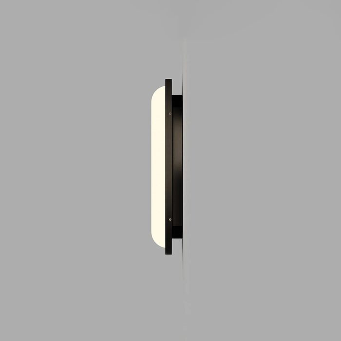 The elongated white glass shade is encased by an aluminium frame available in either an Old Brass or Iron finish.