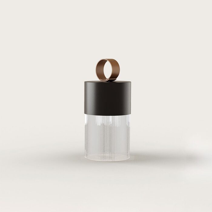 It features a ridged glass shade from which the lamp emits a soft light and is combined with a steel top and synthetic leather loop for ease of use.
