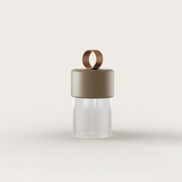 It features a ridged glass shade from which the lamp emits a soft light and is combined with a steel top and synthetic leather loop for ease of use.