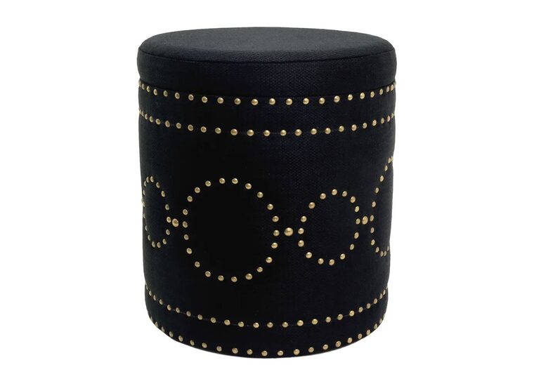 Upholstered in black fabric with brass stud detailing arranged in a circular motif, it opens to reveal a concealed storage compartment, perfect for tidying throws, cushions or everyday essentials.