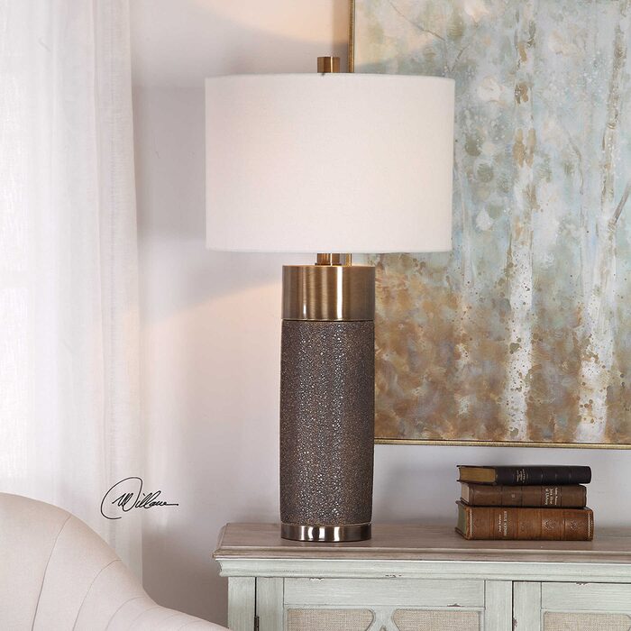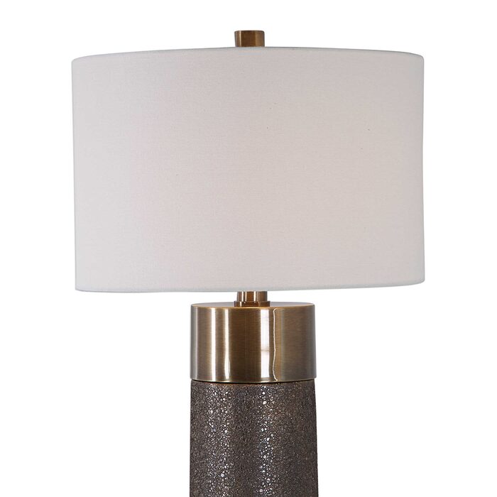 This contemporary table lamp design showcases a heavily textured ceramic base that's finished in a metallic golden bronze, paired with antique brass plated iron details.