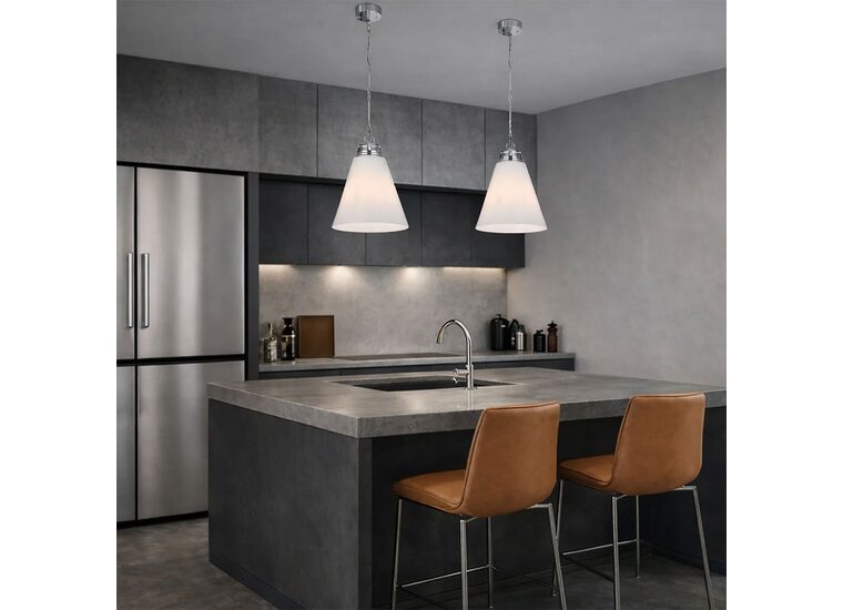 Its design evokes a timeless, transitional style, offering warm, ambient illumination that suits kitchens, dining areas, and living spaces equally well.