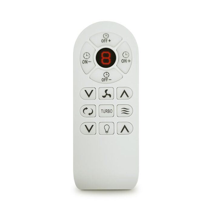 - Supplied with 8 speed remote with turbo speed function and up to 12h timer