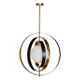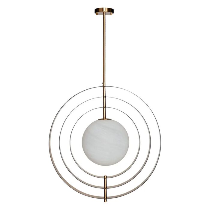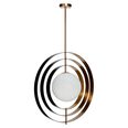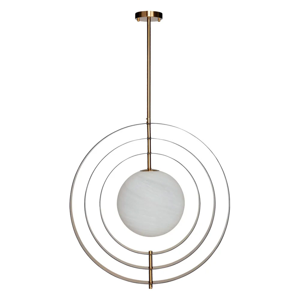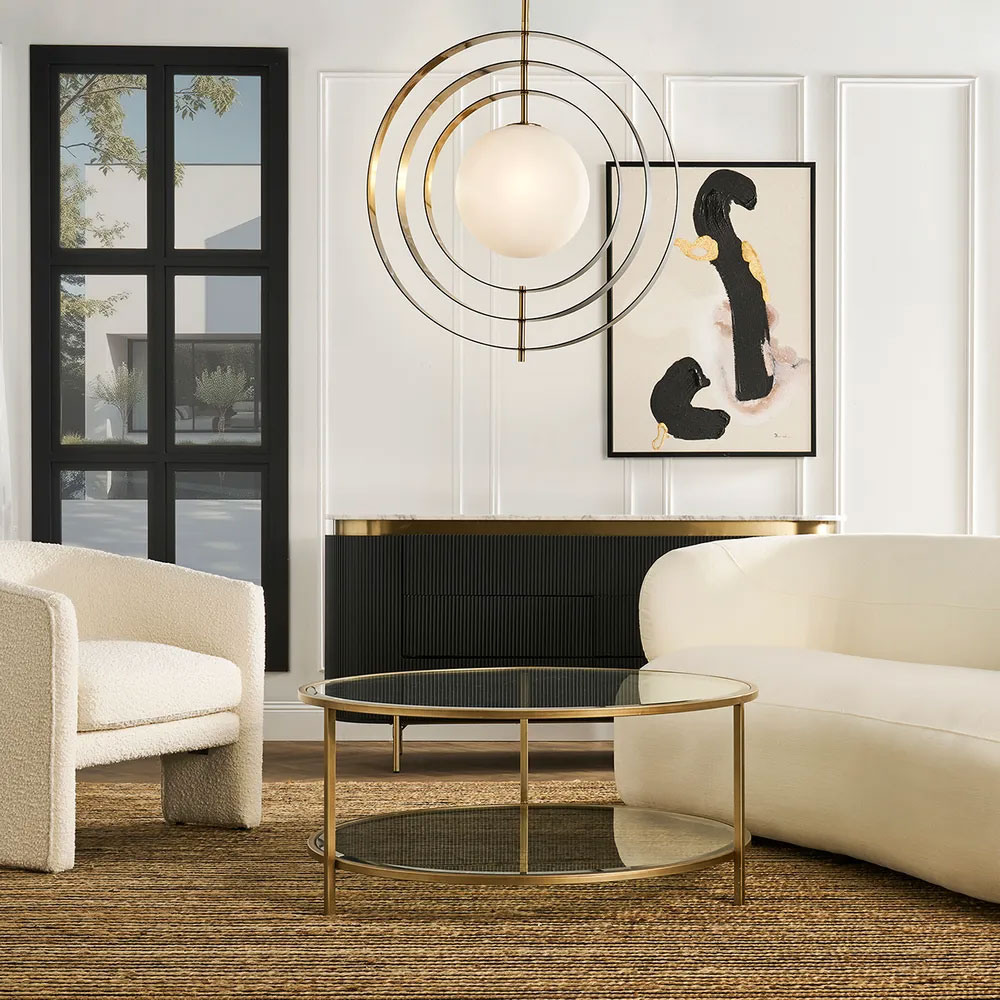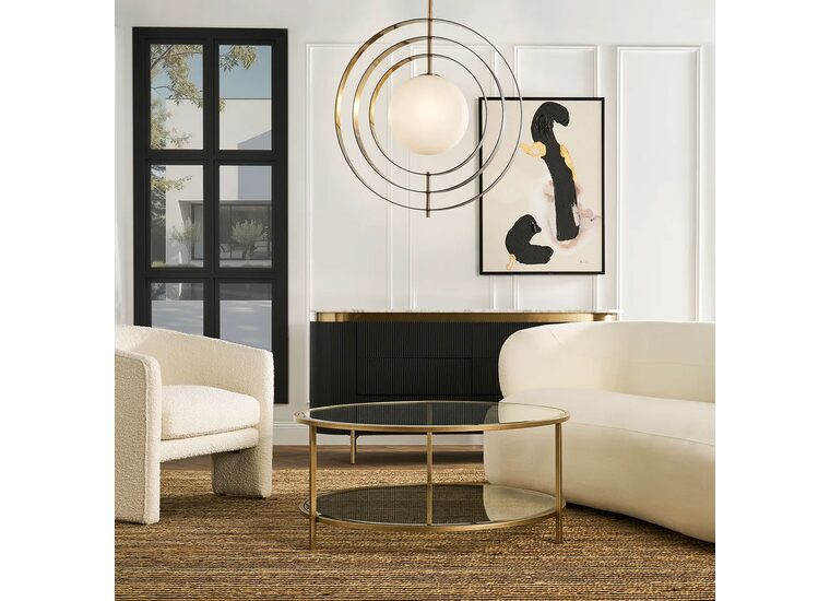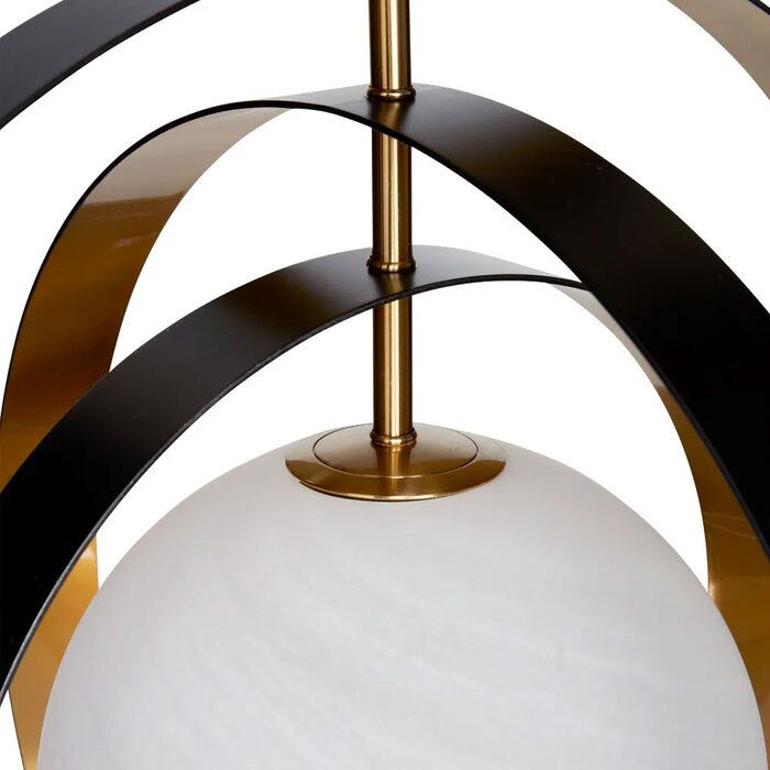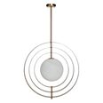 Make a statement with this stunning pendant light, featuring concentric brushed gold and black rings surrounding a frosted white globe.