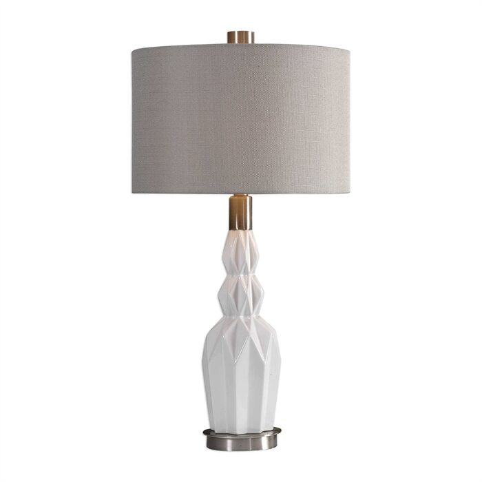 Gloss white ceramic with deeply embossed diamond features, accented with brushed nickel plated details.
