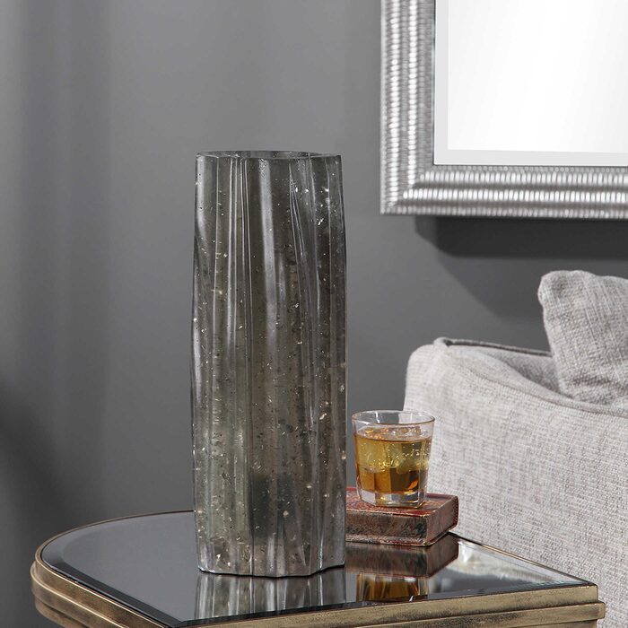 This translucent charcoal gray hurricane lamp features an organic shape with metallic flecks within the base and a curved chiseled like texture.