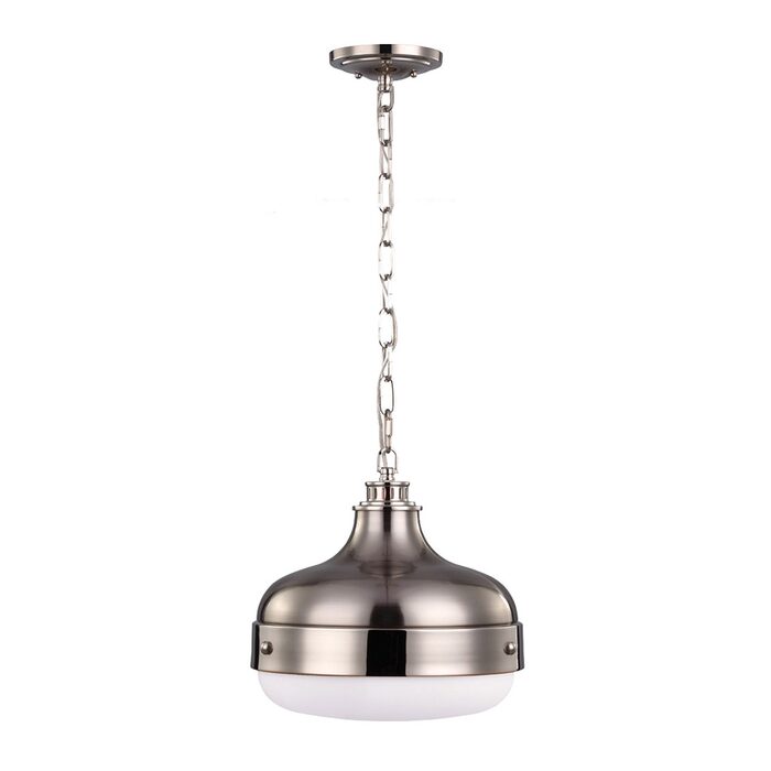 The riveted centre band, as well as the vented top and square-linked chain on the pendants add rich, visual interest yet don’t distract from the clean lines of the overall silhouette.