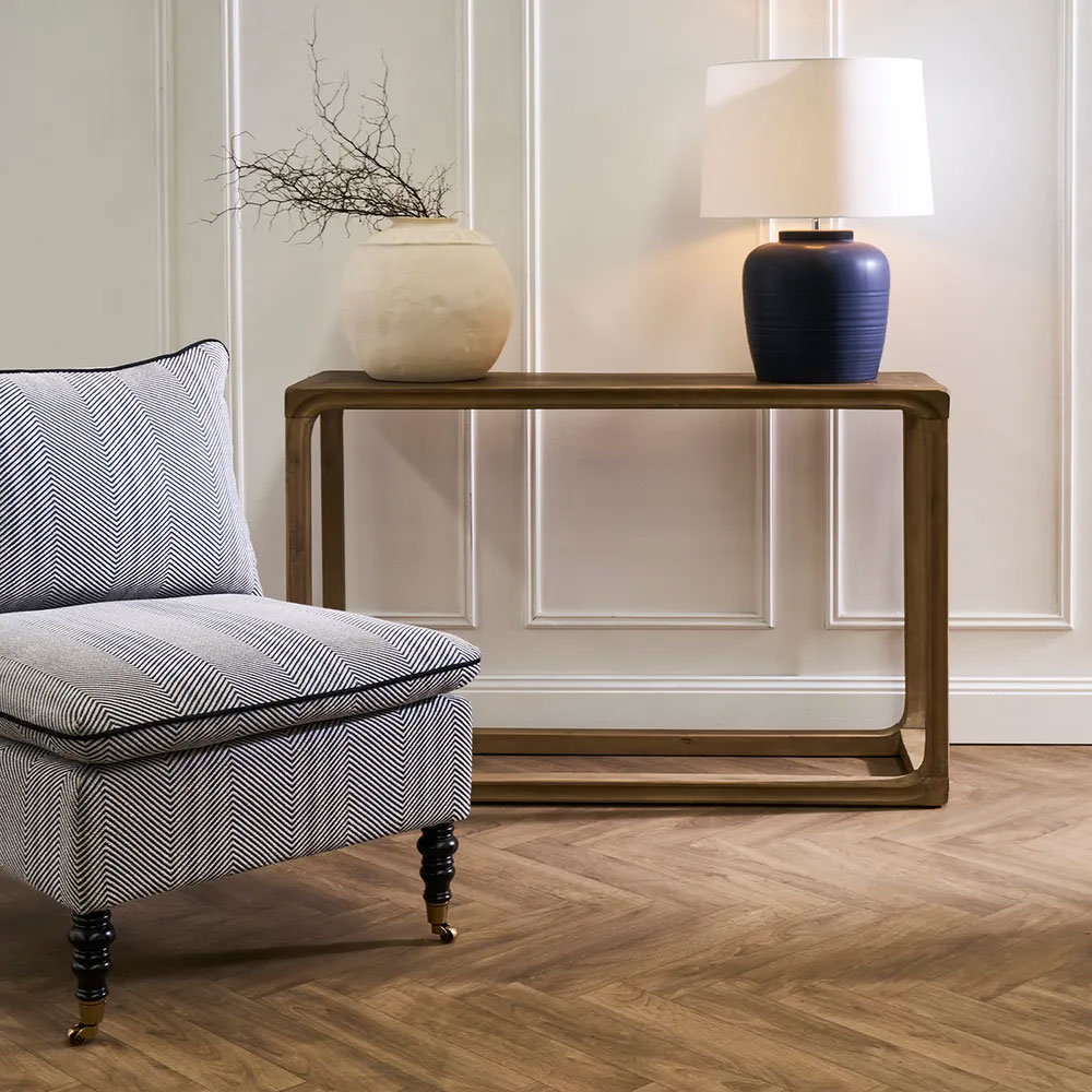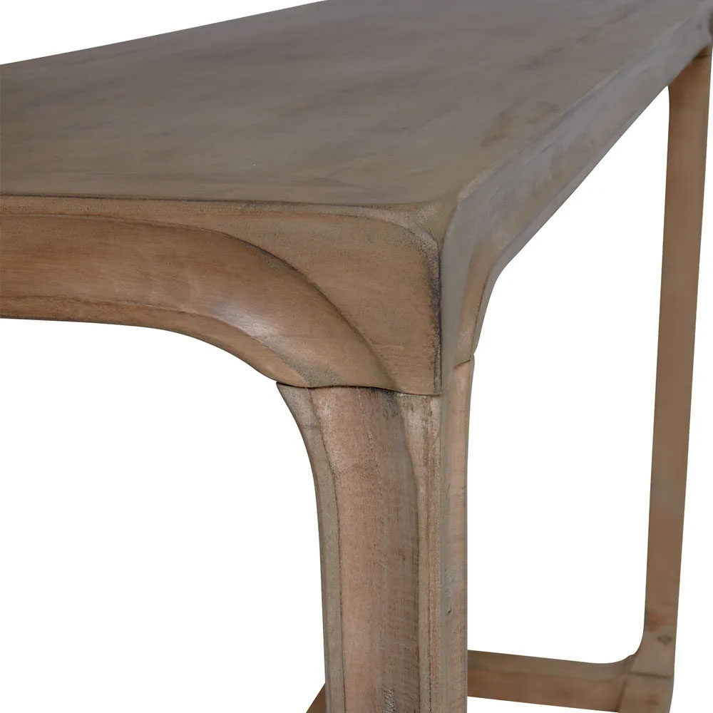 Crafted from solid timber, it features a rectangular top with smooth edges and an open-frame base, providing a modern yet rustic aesthetic.