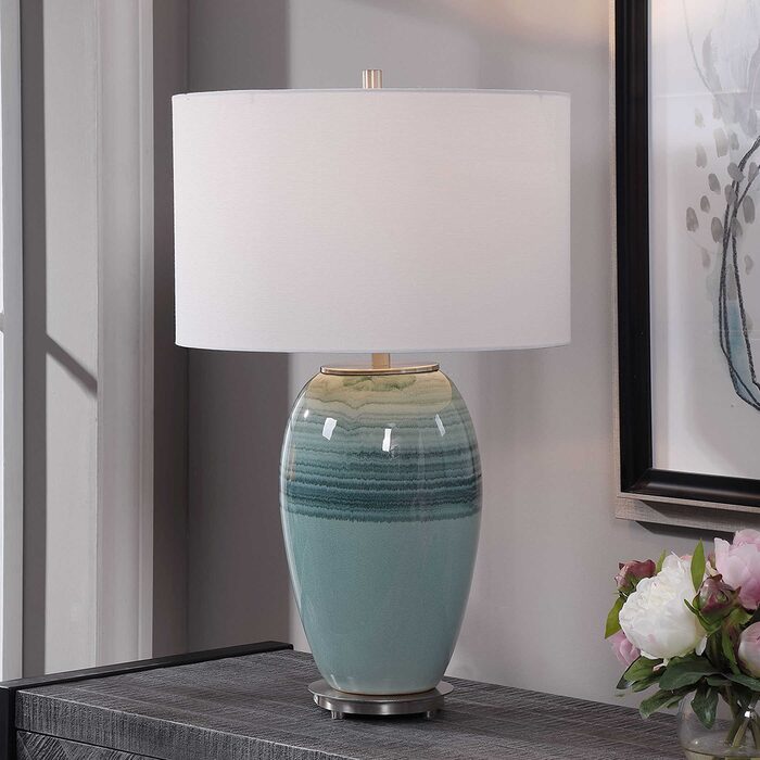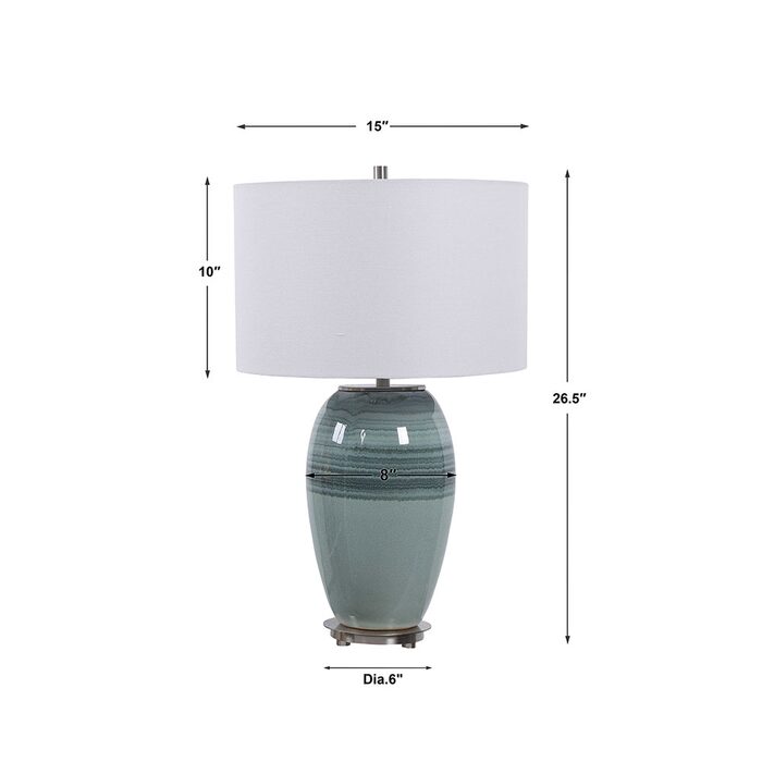 This ceramic table lamp is finished in a beautiful aqua and teal crackle glaze paired with brushed nickel plated accents that add an elegant touch to the piece.