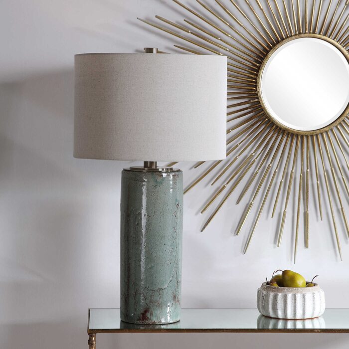 Ceramic table lamp finished in a crackled aqua blue glaze with dark rustic bronze distressing, accented with light antique brushed brass details.