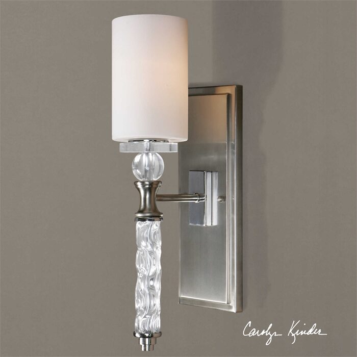 Brushed nickel plated details with a carved glass body, crystal accents and white frosted glass shade.