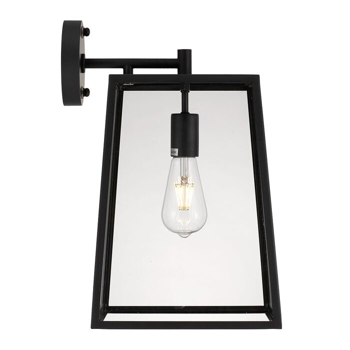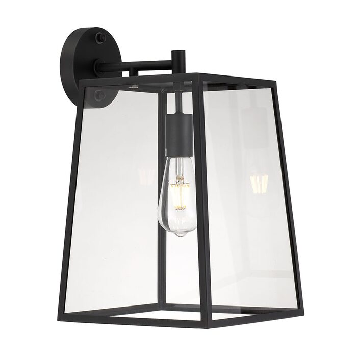 Cantena is a bold yet simple vintage outdoor wall lamp. The tapered frame holds trapezoid clear glass and is suspended by a simple arm.