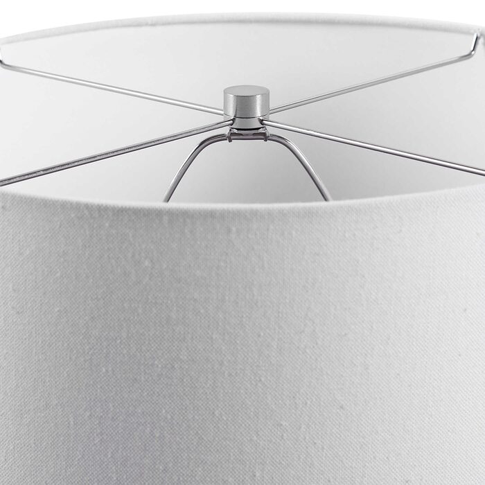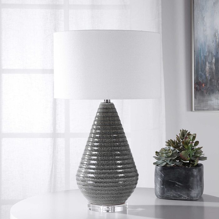 Showcasing a tapered ceramic base with ribbed texture, this transitional table lamp is finished in a smoke gray crackle glaze with a thick crystal foot and brushed nickel accents.