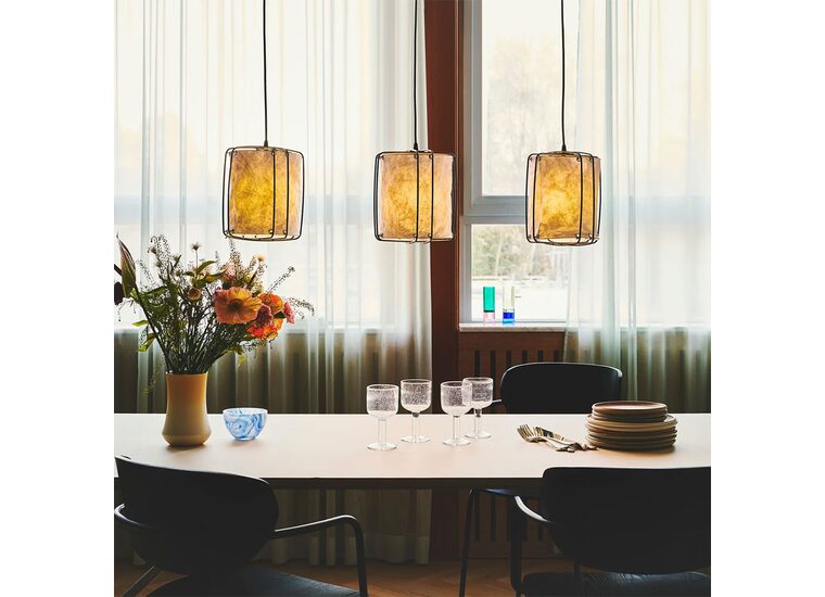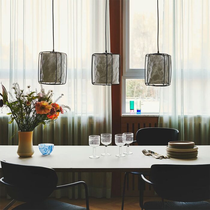 The lightly crinkled paper shade is suspended by thin metal wires and ensures a pleasant, diffused light.