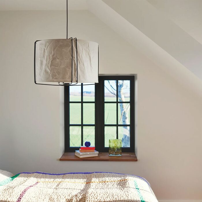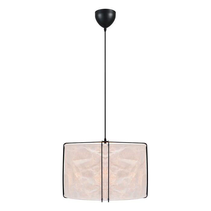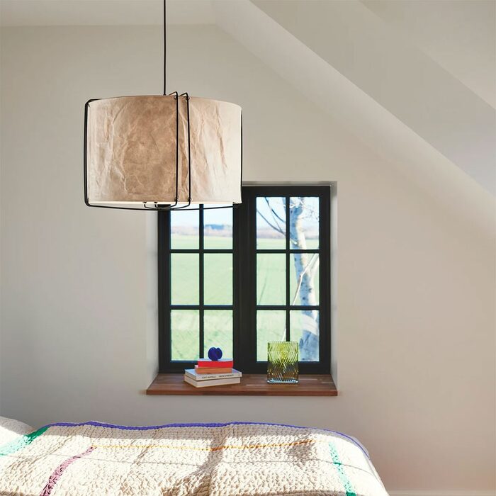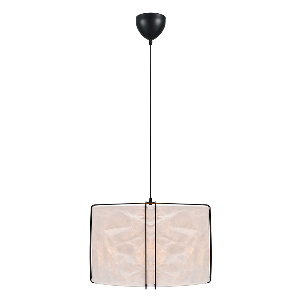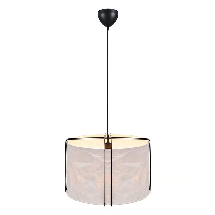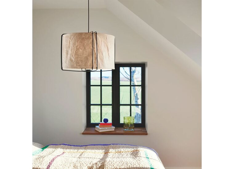 The lightly crinkled paper shade is suspended by thin metal wires and ensures a pleasant, diffused light.