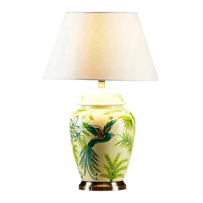 The lamp is delicately hand painted with bird and leaf motif on yellow background.