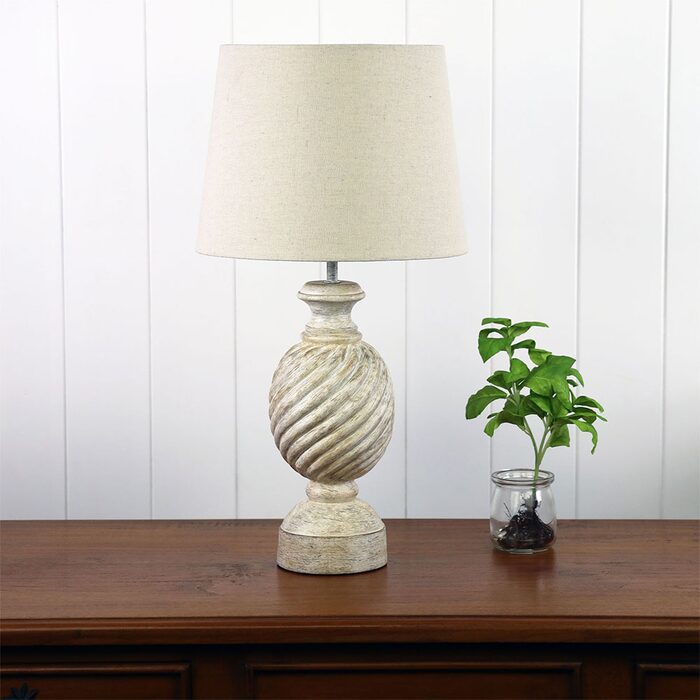 The Carlisle white resin table lamp comes complete with an off-white shade. At 52cm tall, the Carlisle is a statement piece that can adapt to most rooms in your home. The on/off switch is located on the cord.