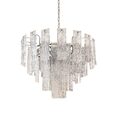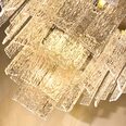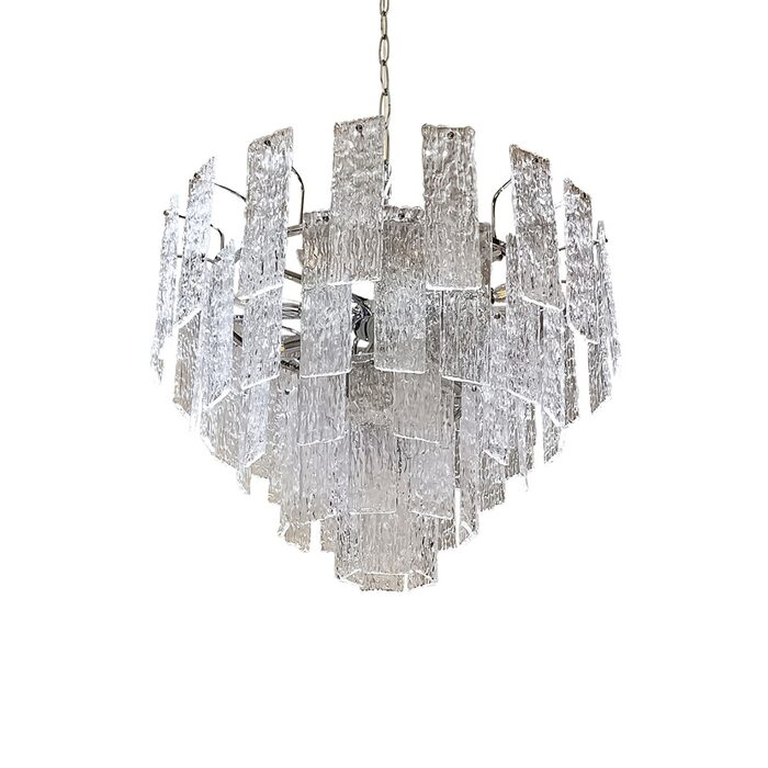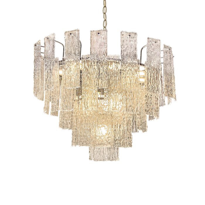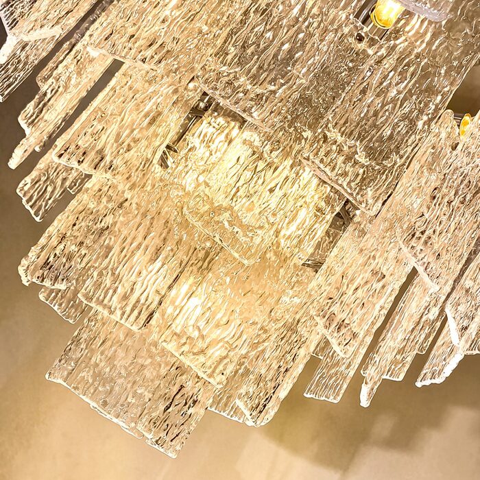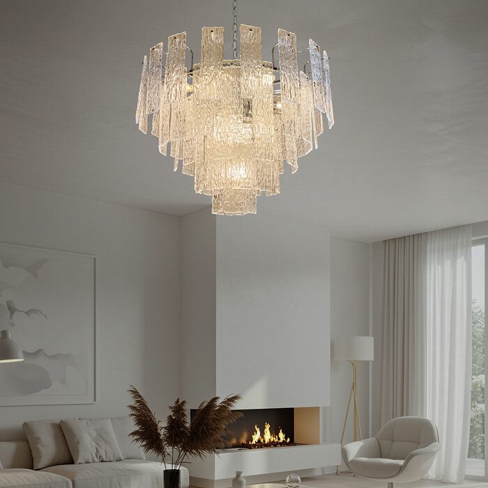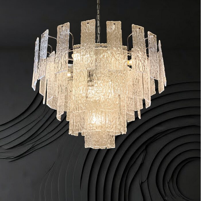 Crafted from exquisite crystal shards, it mimics the mesmerizing flow of water cascading down a waterfall, beautifully reflecting light throughout the space. This chandelier serves as a captivating statement piece, effortlessly enhancing the decor with its eye-catching design.