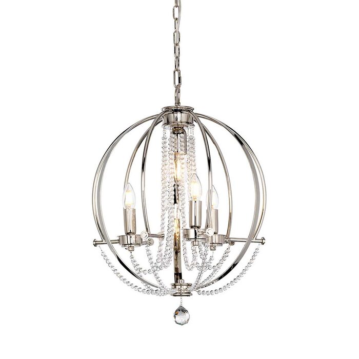 The Cassie range provides a decorative twist on the modern spherical form. The chandeliers are provided with both metal bands and crystal swags for a customisable look below the candle holders.