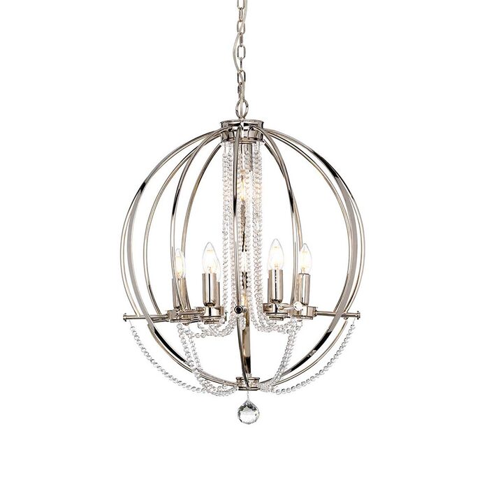 The Cassie range provides a decorative twist on the modern spherical form. The chandeliers are provided with both metal bands and crystal swags for a customisable look below the candle holders.