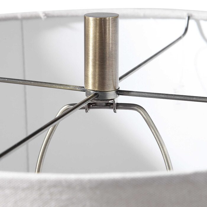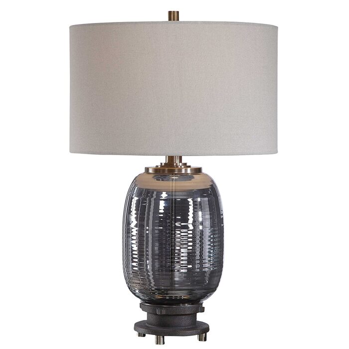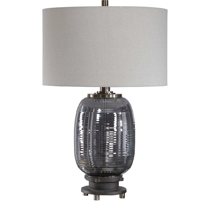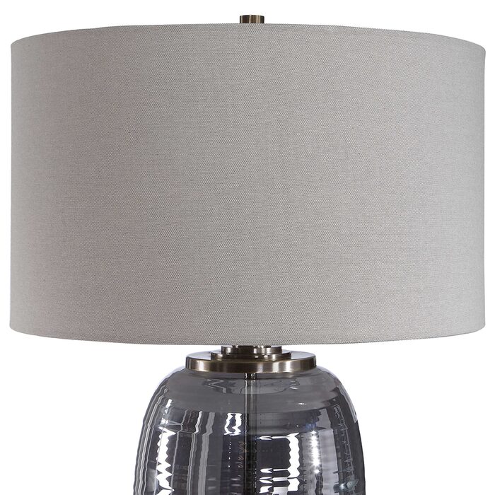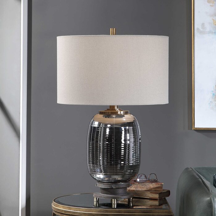 This contemporary table lamp has an iridescent amber glass base with a wavy textured surface.
