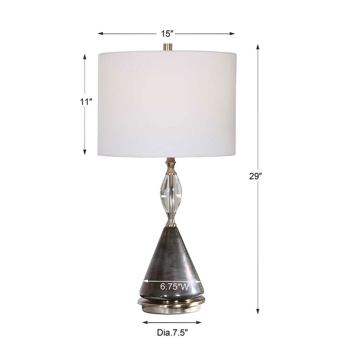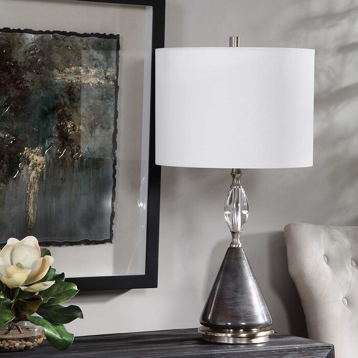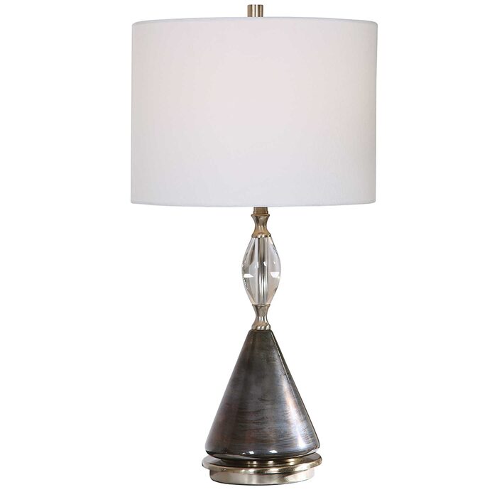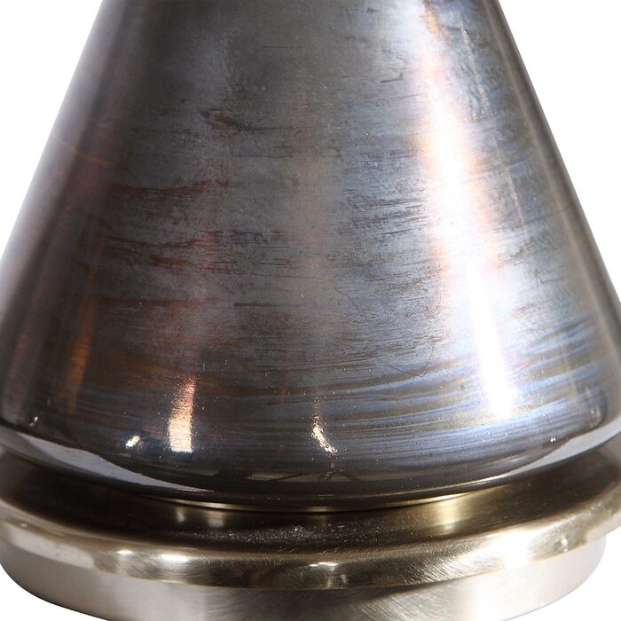 This table lamp features a cone glass base that's finished in a plated, iridescent, oxidized dark bronze that's paired with brushed nickel details and a decorative crystal egg ornament.