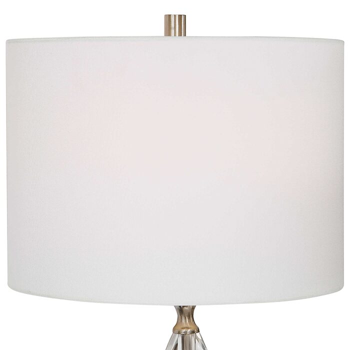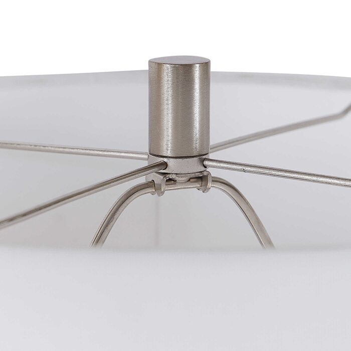 A hardback drum shade in white linen fabric completes this piece.