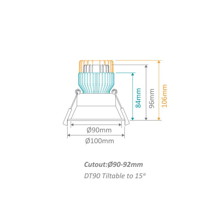 Cell frame DT90 90mm cut-out tiltable frame only to suit Cell downlight module series. Powder coated aluminium frame.