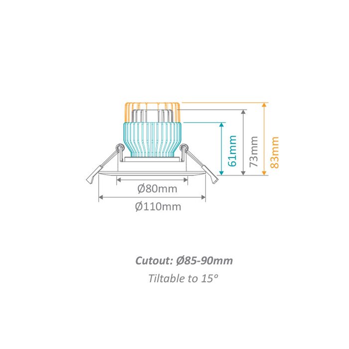 Cell frame T90 90mm cut-out tiltable frame only to suit Cell downlight module series. Powder coated aluminium frame.