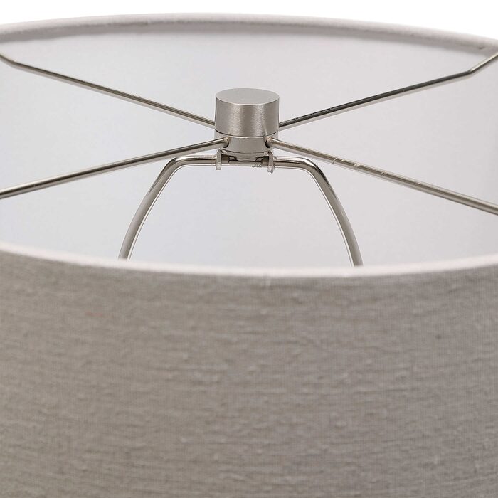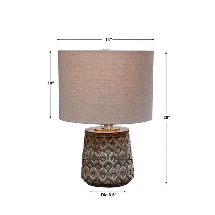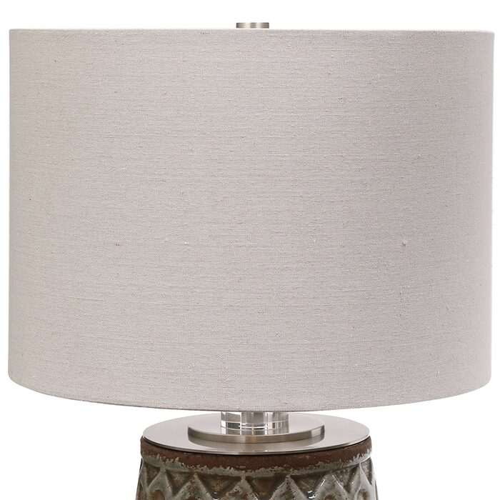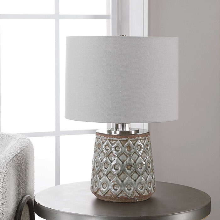 A transitional take on an old world look, this ceramic table lamp features a heavily distressed blue-gray crackle glaze with intricate embossed geometric details, accented with brushed nickel details and a thick crystal collar.